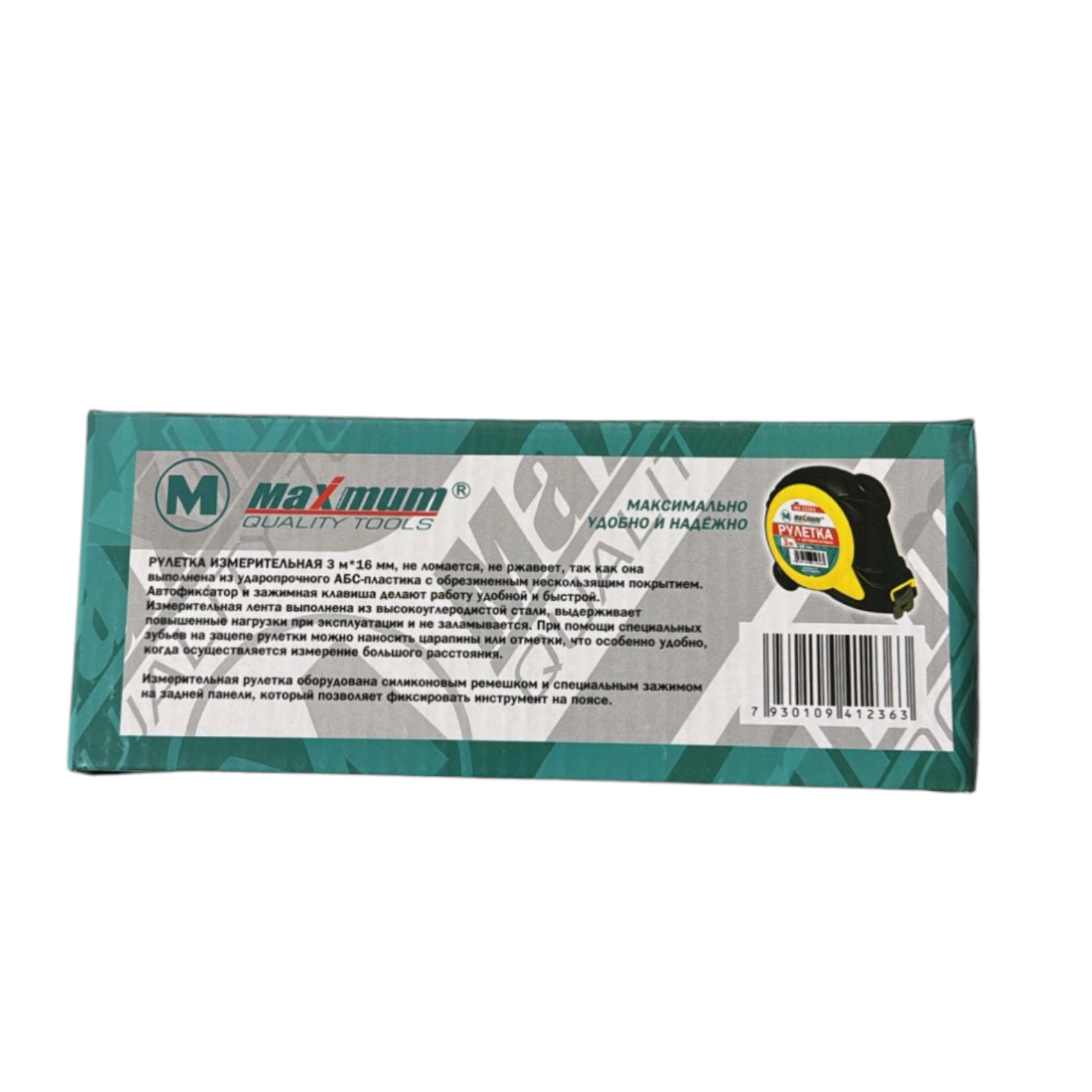 Рулетка измерительная 3 м x 16 мм от нашего фирменного бренда "MAXIMUM QualityTools" не ломается, не ржавеет, так как она выполнена из ударопрочного АБС-пластика с обрезиненным нескользящим покрытием. Автофиксатор и зажимная клавиша делают работу удобной и быстрой. Измерительная лента выполнена из высокоуглеродистой стали, выдерживает повышенные нагрузки при эксплуатации и не заламывается. При помощи специальных зубьев на зацепе рулетки можно наносить царапины или отметки, что особенно удобно, когда осуществляется измерение большого расстояния.