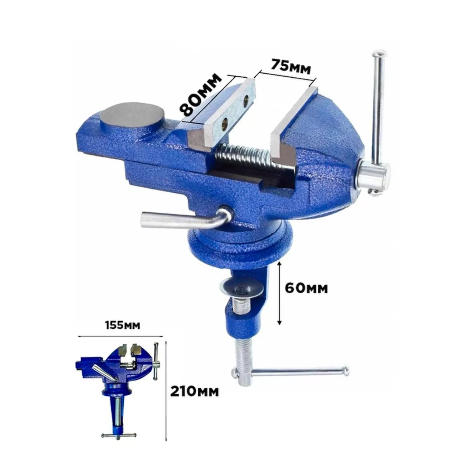 Массивный чугунный корпус и основание покрыты краской, защищающей тиски от коррозии и увеличивает их рабочий ресурс. Зажимные губки 80 мм выполнены из закалённой стали высокого качества. Корпус, с возможностью поворота на 360° относительно основания, способствует удобной обработке заготовки. Наличие наковальни расширяет функциональные возможности слесарных тисков.