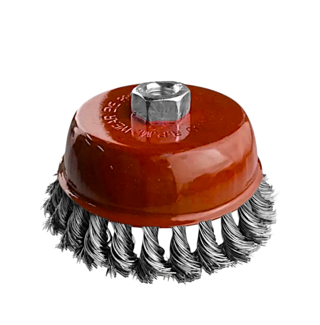 Чашечная щетка 100 мм — сменный элемент для угловых шлифовальных машин. Применяется для шлифовки, полирования, зачистки от лака, краски и коррозии различных поверхностей. Тип крепления - М14, Max RPM - 3750.